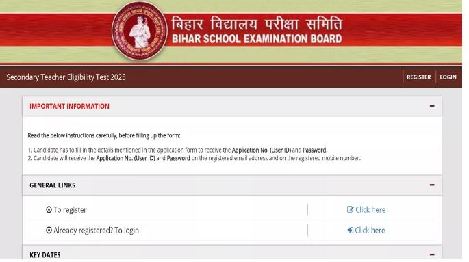 बिहार विद्यालय परीक्षा समिति की ओर से बिहार माध्यमिक शिक्षा पात्रता परीक्षा (STET) के लिए एडमिट कार्ड डाउनलोड करने की तिथि जारी कर दी गई है। जिन उम्मीदवारों ने Bihar STET 2025 के लिए रजिस्ट्रेशन किया है, वे जल्द ही परीक्षा में शामिल होने के लिए एडमिट कार्ड डाउनलोड कर सकेंगे। एडमिट कार्ड आधिकारिक वेबसाइट पर जारी किए जाएंगे। एडमिट कार्ड डाउनलोड करने के लिए उम्मीदवारों को रजिस्ट्रेशन नंबर और जन्मतिथि को दर्ज करना होगा।