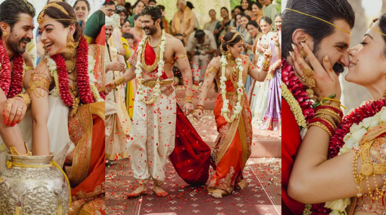 एंटीक गोल्ड डिटेलिंग और मंदिर मोटिफ्स ने खास बनाया रश्मिका-विजय का वेडिंग लुक