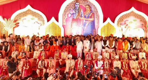 नवविवाहित जोड़ों, जिनमें मुख्यमंत्री के बेटे और बहू भी शामिल थे, को प्रमुख हिंदू संतों और धर्मगुरुओं से आशीर्वाद मिला। इनमें योग गुरु बाबा रामदेव, हिंदू राष्ट्र समर्थक और धर्मोपदेशक पंडित धीरेंद्र कृष्ण शास्त्री ‘बागेश्वर धाम सरकार’ और अखाड़ा परिषद के प्रमुख महंत रवींद्र पुरी महाराज शामिल थे।