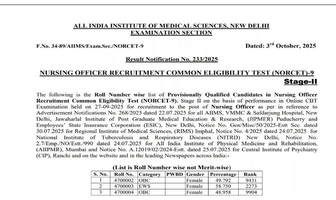 अखिल भारतीय आयुर्विज्ञान संस्थान (AIIMS) की ओर से नर्सिंग ऑफिसर रिक्रूटमेंट कॉमन एलिजिबलिटी टेस्ट (NORCET)-9 स्टेज-2 परीक्षा का रिजल्ट जारी कर दिया गया है। जो उम्मीदवार स्टेज-2 की परीक्षा में शामिल हुए थे और रिजल्ट का बेसब्री से इंतजार कर रहे थे अब वे आधिकारिक वेबसाइट पर जाकर स्टेज-2 परीक्षा का रिजल्ट देख व डाउनलोड कर सकते हैं। बता दें, स्टेज-2 परीक्षा का रिजल्ट पीडीएफ फॉर्मेट में जारी किया गया है।