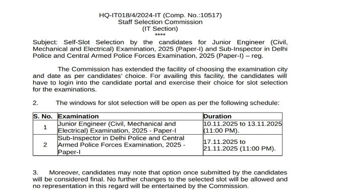 कर्मचारी चयन आयोग (SSC ) की ओर से जूनियर इंजीनियर, दिल्ली पुलिस और केंद्रीय सशस्त्र पुलिस बल में सब-इंस्पेक्टर परीक्षा की तैयारी करने वाले उम्मीदवारों के लिए एक बड़ी खुशखबरी है। दरअसल एसएससी की ओर से सीएचएसएल परीक्षा की तरह ही अभ्यर्थियों को अपनी सुविधानुसार परीक्षा शहर और परीक्षा तिथि का चयन करने का मौका दिया जा रहा है। जो उम्मीदवार इन परीक्षाओं में शामिल होने वाले हैं, वे एसएससी की आधिकारिक वेबसाइट पर जाकर SSC CPO SI 2025 के लिए सेल्फ स्लॉट बुकिंग कर सकेंगे। बता दें, सेल्फ स्लॉट बुकिंग 17 नवंबर से शुरू हो जाएगी।