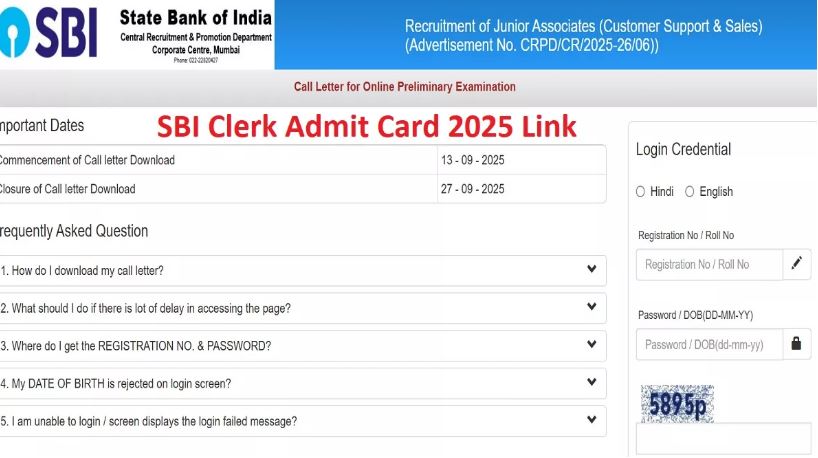 एसबीआई क्लर्क भर्ती 2025 परीक्षा में कुछ दिन ही शेष हैं। ऐसे में अभ्यर्थियों को एडमिट कार्ड जारी होने का बेसब्री से इंतजार था जो खत्म हो गया है। एसबीआई की ओर से सभी आवेदनकर्ताओं के एडमिट कार्ड ऑनलाइन माध्यम से SBI की ऑफिशियल वेबसाइट sbi.co.in पर डाउनलोड के लिए उपलब्ध करवा दिए गए हैं जहां से वे लॉग इन डिटेल दर्ज कर इसे डाउनलोड कर सकते हैं। ध्यान रखें कि पोस्ट या अन्य किसी भी प्रकार से एडमिट कार्ड नहीं भेजे जायेंगे। एडमिट कार्ड का लिंक 27 सितंबर तक एक्टिवेट रहेगा।