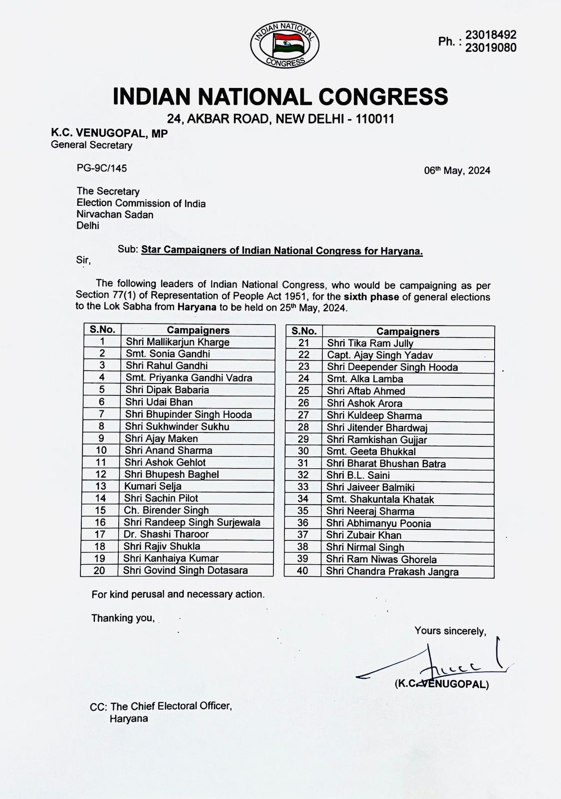 कांग्रेस ने हरियाणा की 10 लोकसभा व एक विधानसभा सीट पर प्रचार के लिए स्टार प्रचारकों की लिस्ट जारी की है। इस लिस्ट में कांग्रेस के बड़े नामों के अलावा प्रदेश के कई नेताओं को जगह दी गई है। 40 नामों वाली लिस्ट में कांग्रेस अध्यक्ष मल्लिकार्जुन खऱगे, सोनिया गांधी, राहुल गांधी, प्रियंका गांधी व हरियाणा प्रभारी दीपक बाबरिया का नाम शामिल हैं।