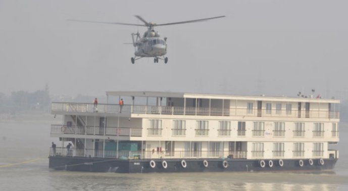 लगभग 30 से 40 मिनट तक हेलिकॉप्टर क्रूज के ऊपर मंडराता रहा और इस बीच घाट पर बैठे पर्यटक और नाविकों ने दूर से ही अपने मोबाइल से इस दृश्य को अपने कैमरे में कैद किया। कुछ लोगों ने सोशल मीडिया पर भी वीडियो और फोटो साझा किए।