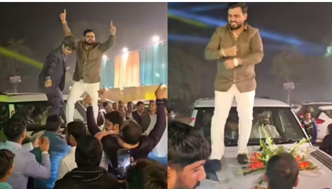 पवन सिंह के ‘राजा जी के दिलवा’ पर बंदा डांस करते हुए ऐसा माहौल बनाता है कि देखते-देखते गाड़ी के बोनट पर 3-3 लोग चढ़ जाते हैं और फिर जमकर डांस होता है। यह सब देखकर दूल्हा भी अंदर बैठे-बैठे मंद मंद मुस्कुरा रहाहै।