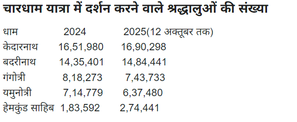 पर्यटन विभाग के आंकड़ों के अनुसार 2024 में चारधाम व हेमकुंड साहिब में कुल 48.04,216 श्रद्धालुओं ने दर्शन किए थे। इस बार अक्तूबर माह में ही यह आंकड़ा पार होने से नया रिकॉर्ड बन गया है। जबकि 2023 में चारधाम यात्रा में 56 लाख से अधिक श्रद्धालु आए थे। इस साल खराब मौसम के साथ आपदा की घटनाओं का चारधाम यात्रा पर बड़ा असर पड़ा। उत्तरकाशी जिले के धराली व हर्षिल में आए भयानक आपदा से यमुनोत्री व गंगोत्री धाम की यात्रा कई दिनों तक पूरी तरह से बंद रही।