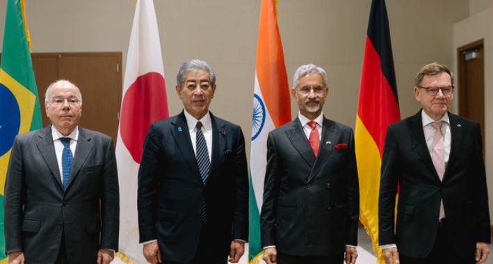 भारत, ब्राजील, जर्मनी और जापान के विदेश मंत्रियों ने संयुक्त राष्ट्र महासभा (यूएनजीए) के 80वें सत्र के दौरान मुलाकात कर संयुक्त राष्ट्र सुरक्षा परिषद (यूएनएससी) में सुधार की तत्काल जरूरत पर जोर दिया। इस बैठक में भारत के विदेश मंत्री डॉ. एस. जयशंकर, ब्राजील के विदेश मंत्री माउरो विएरा, जर्मनी के फेडरल विदेश मंत्री डॉ. जोहान वेडफुल और जापान के विदेश मंत्री इवाया ताकेशी शामिल हुए।