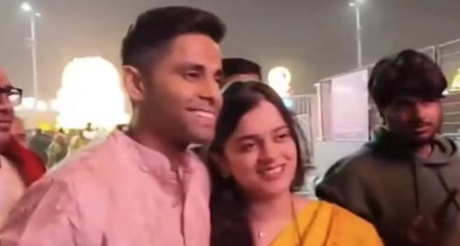 सू्र्यकुमार ने गुलाबी रंग की शेरवानी पहने हुई थी जबकि उनकी पत्नी देविशा ने सिल्क साड़ी पहनी थी। मंदिर के बाहर सूर्यकुमार ने मीडिया से भी बात की। उन्होंने फैंस से भी मुलाकात की और जिन्होंने सेल्फी मांगी थी उनके साथ सेल्फी भी खिंचवाई।