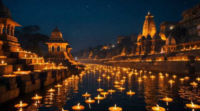 अयोध्या में देव दीपावली के दिन राम जन्मभूमि और अन्य प्रमुख मंदिरों को दीपों से सजाया जाता है। शहर की गलियां, बाजार और मंदिर भव्य रोशनी में नहाए रहते हैं। विशेष पूजा, सांस्कृतिक कार्यक्रम और भव्य झांकियाँ यहां के उत्सव को दर्शनीय बनाती हैं।