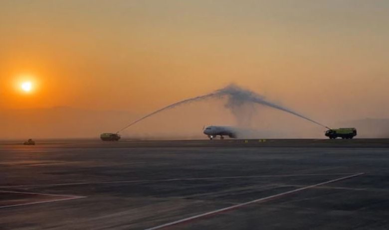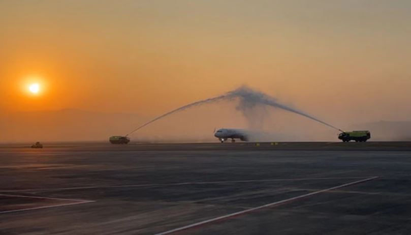 वाटर कैनन सैल्यूट एक औपचारिक परंपरा है, जिसमें विमान के टैक्सी करते समय फायर ट्रक उस पर पानी की बौछार करते हैं। पहली उड़ान के उतरने से पहले इंडिगो के कर्मचारियों ने केक काटकर और नारियल फोड़कर इसका जश्न मनाया। लैंडिंग के बाद एयरपोर्ट से पहली उड़ान इंडिगो की फ्लाइट 6E882 हैदराबाद के लिए सुबह 8:40 बजे रवाना हुई।