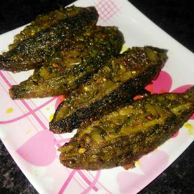 जितने करेले हैं, मसाले को उतने भागों में बांट लीजिये। एक करेला उठाइये और मसाला भर कर प्लेट में रखिये। इसी तरह सारे करेले मसाला भर कर प्लेट में रख लीजिये। कढ़ाई में तेल डालकर गरम कीजिये, तेल में 1/4 छोटी चम्मच हल्दी डालिये और करेले सिकने के लिये तेल में लगाकर रख दीजिये। मीडियम आग पर करेले सिकने दीजिये।