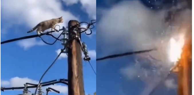 बिजली के तार पर चल रही थी बिल्ली, लगा इतनी जोर का करंट की पोल में भी लग गई आग