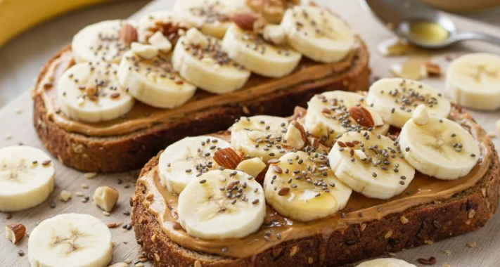 अब टोस्ट के ऊपर केले की स्लाइस को अच्छे से सजाएं। इसके बाद, कटे हुए बादाम या अखरोट और चिया सीड्स/फ्लैक्स सीड्स को ऊपर से छिड़कें। अगर आपको हल्का मीठा पसंद है, तो ऊपर से थोड़ा सा शहद भी डाल सकते हैं।