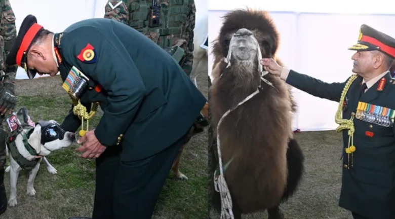 भारतीय सेना प्रमुख उपेंद्र द्विवेदी ने दो बैक्ट्रियन ऊंट, दो जांस्कारी पोनी और दो आर्मी डॉग्स को सम्मानित किया है। बर्फीली जगहों से लेकर रेगिस्तानी इलाकों तक भारतीय सेना में शामिल ये साथी कई चुनौतीपूर्ण अभियानों में अहम भूमिका निभा चुके हैं।