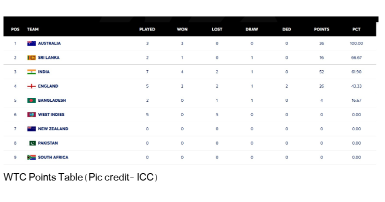 आईसीसी वर्ल्ड टेस्ट चैंपियनशिप 2025-27 की अंक तालिका में टॉप पर ऑस्ट्रेलियाई टीम है, जिनका जीत प्रतिशत 100 का है। दूसरे नंबर पर श्रीलंकाई टीम है, जिन्होंने 2 में से एक मैच जीतकर 16 अंक और 66.67 जीत प्रतिशत हासिल किया है। नंबर 3 पर टीम इंडिया है, जिन्होंने 7 में से 4 मैच जीते है, जबकि दो मैच में हार और एक मैच में उन्हें ड्रॉ का सामना करना पड़ा है। टीम इंडिया के पास 52 अंक है और उनका जीत प्रतिशत 61.90 हो गया है। नंबर-4 पर इंग्लैंड की टीम 5 मैच में से 2 मैच जीतकर 26 अंक और 43.33 जीत प्रतिशत के साथ मौजूद है।