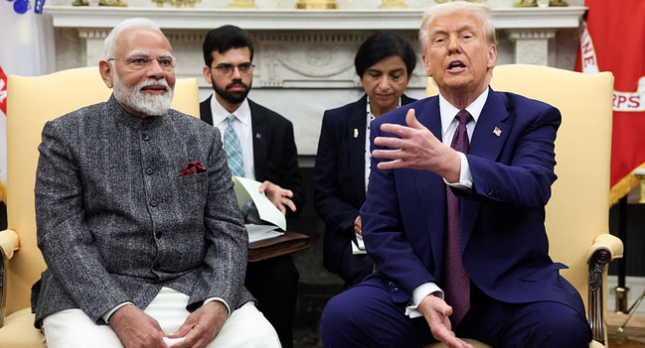 ओवल ऑफिस में पत्रकारों के सवालों का जवाब देते हुए अमेरिका के राष्ट्रपति डोनाल्ड ट्रंप ने कहा कि प्रधानमंत्री नरेंद्र मोदी उनके अच्छे मित्र हैं और दोनों के बीच शानदार संबंध हैं। आगे उन्होंने कहा कि भारत जल्द ही रूस से तेल की खरीद बंद कर देगा। उन्होंने यह भी दावा किया कि ऐसा आश्वासन खुद प्रधानमंत्री नरेंद्र मोदी ने उन्हें व्यक्तिगत रूप से दिया है। ट्रंप ने कहा कि भारत का यह कदम एक बड़ा कदम है। अब हमें चीन से भी यही करने के लिए कहना होगा।