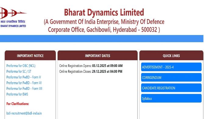 सरकारी नौकरी की तलाश कर रहे युवाओं के लिए खुशखबरी है। भारत डायनेमिक्स लिमिटेड (BDL) में मैनेजमेंट ट्रेनी (MT) के रिक्त पदों को भरने के लिए भर्ती निकाली गई है जिसके लिए आवेदन प्रक्रिया आज यानी 3 दिसंबर से स्टार्ट हो गई है। जो भी अभ्यर्थी एमटी पदों के लिए पात्रता पूरी करते हैं वे भर्ती में शामिल होने के लिए ऑनलाइन माध्यम से बीडीएल की ऑफिशियल वेबसाइट bdl-india.in पर जाकर आवेदन प्रक्रिया पूर्ण कर सकते हैं। एप्लीकेशन फॉर्म भरने की लास्ट डेट 29 दिसंबर 2025 (शाम 4 बजे तक) निर्धारित है।
