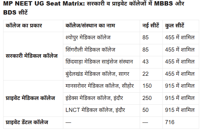 इस बार छात्रों को बड़ी राहत देते हुए कुल 685 नई एमबीबीएस सीटें जोड़ी गई हैं। इनमें श्योपुर मेडिकल कॉलेज और सिंगरौली मेडिकल कॉलेज में 85-85 सीटें, छिंदवाड़ा मेडिकल साइंसेज संस्थान में 43 सीटें और बुंदेलखंड मेडिकल कॉलेज सागर में 22 सीटें शामिल हैं।