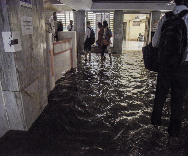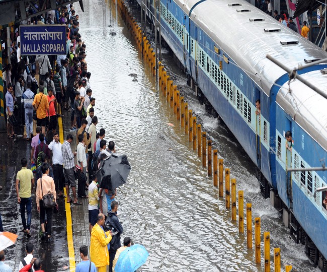 भारी जलभराव होने से डूबा नालासोपारा रेलवे स्टेशन। ट्रेन का इंतजार करते लोग।