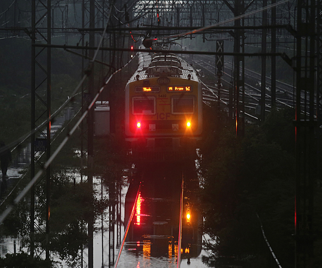मूसलाधार बारिश की वजह से रेलवे ट्रैक पर भरा पानी। रुक-रुक कर चल रही मुंबई लोकल।