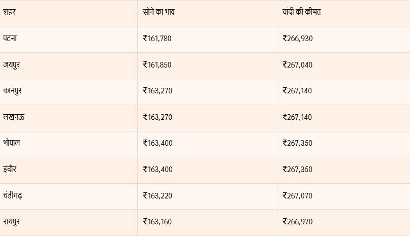 भोपाल और इंदौर में सोना और चांदी सबसे महंगा है। यहां 10 ग्राम सोने की कीमत 1,63,400 रुपये चल रही है। इसके साथ ही 1 किलो चांदी का भाव 2,67,350 रुपये चल रहा है।