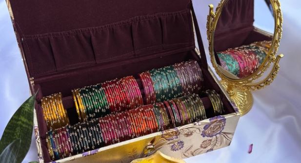 कुंदन वर्क की रेनड्रॉप चूड़ियां बेहद खूबसूरत और क्लासी लगती हैं। ये चूड़ियां साड़ी, लहंगे या सलवार-सूट के साथ आसानी से मैच हो जाती हैं। पारंपरिक और आधुनिक डिजाइन में बनी इन चूड़ियों पर रेनड्रॉप या बूंद के आकार का कुंदन वर्क होता है। यह मेटल या कांच दोनों में आती हैं, जो शादियों से लेकर हर खास अवसरों पर पहनने के लिए परफेक्ट हैं।