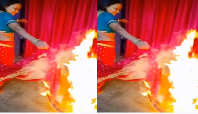 वायरल होने के लिए महिला ने साड़ी में आग लगाकर बनाई वीडियो