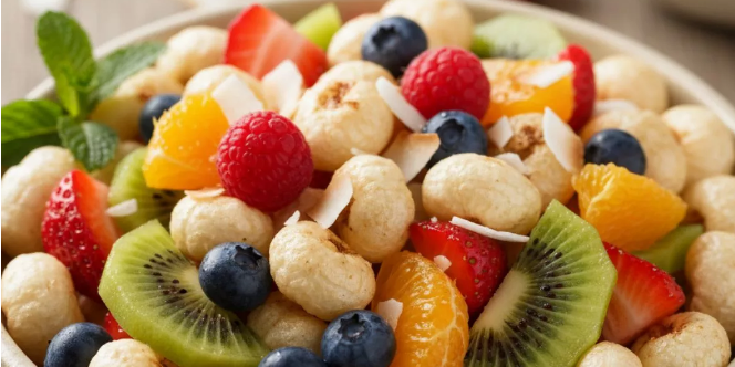अगर आप कुछ हल्का और फ्रेश खाना चाहते हैं तो मखाने को फलों के साथ खाएं। एक कटोरी कटे हुए फल जैसे केला, सेब, पपीता और अनार के दानों में भुने हुए मखाने मिलाएं। आप चाहें तो इसमें थोड़ा शहद भी डाल सकते हैं। यह कॉम्बिनेशन फाइबर और विटामिन से भरपूर होता है, जो पाचन को भी दुरुस्त रखता है।