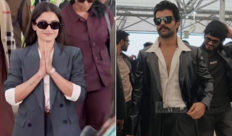 हैदराबाद एयरपोर्ट से विजय और रश्मिका के कई वीडियोज सामने आए हैं। इन वीडियोज में कपल काफी खुश नजर आ रहा है। विजय सफेद शर्ट और काली पैंट के साथ ब्लैक लेदर जैकेट में नजर आए। इस दौरान विजय ने अपनी नई हेयरस्टाइल और घुमावदार मूंछों को फ्लॉन्ट किया। उनके साथ उनके भाई आनंद देवरकोंडा, दोस्त और टीम के सदस्य भी थे।