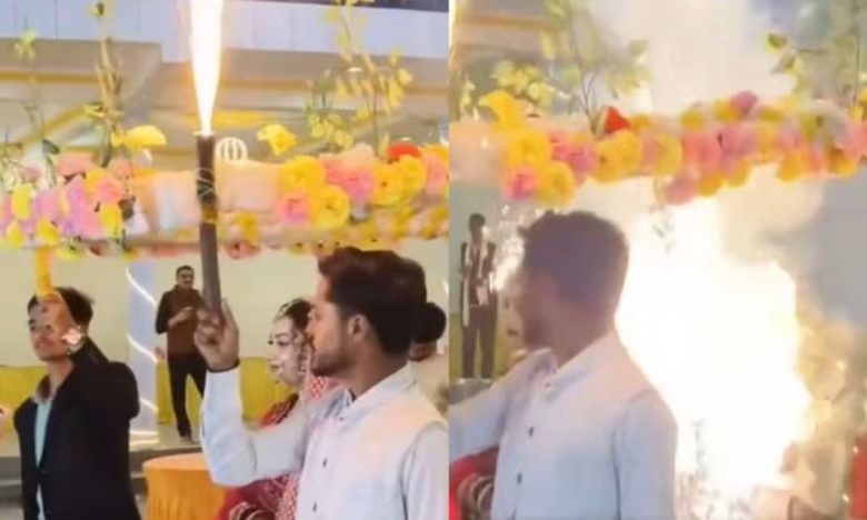 वायरल वीडियो में देखा जा सकता है कि वरमाला के लिए दुल्हन को लेकर परिजन स्टेज पर जा रहे हैं। डांस और म्यूजिक का माहौल बना हुआ है। दुल्हन के ऊपर एक फूलों और लाइट्स से सजी चादर लगी है, जिसे कुछ लोगों ने पकड़ रखा है। फूलों की चादर में मशाल लगी हुई है, जो फुलझड़ी की तरह जल रही है। इस दौरान कुछ ऐसा होता है कि दुल्हन का भाई खतरे में पड़ जाता है।