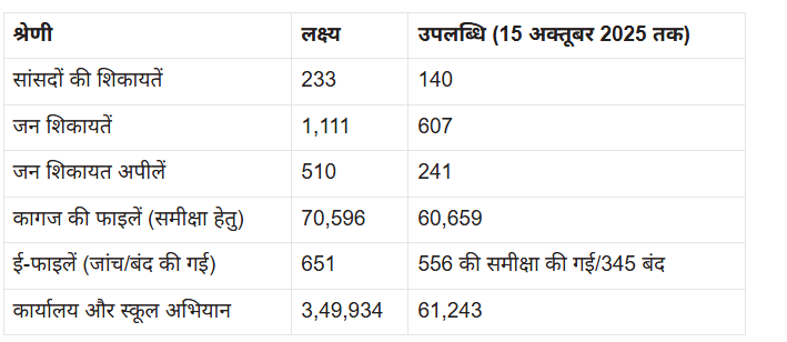 इसके अलावा, समीक्षा के लिए तय की गई 70,596 कागजी फाइलों में से अब तक 60,659 की जांच हो चुकी है। इसके अलावा, कुल 556 ई-फाइलों की समीक्षा की गई है, जिनमें से 345 फाइलें बंद कर दी गई हैं। कार्यालयों और स्कूलों में 3,49,934 अभियान चलाने का लक्ष्य रखा गया था, जिसमें से अब तक 61,243 अभियान पूरे किए जा चुके हैं।