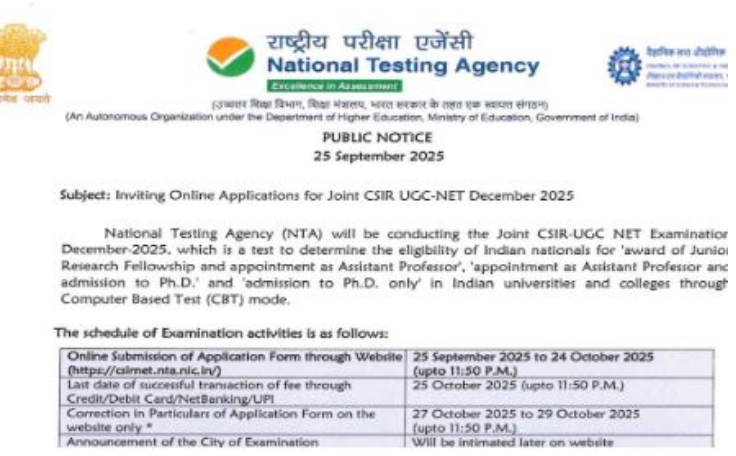 राष्ट्रीय परीक्षा एजेंसी (NET) की ओर से जॉइंट सीएसआईआर यूजीसी नेट दिसंबर सेशन 2025 में रजिस्ट्रेशन करने की आज अंतिम तिथि है, जिन उम्मीदवारों ने अभी तक किसी कारणवश CSIR-UGC NET December 2025 परीक्षा के लिए रजिस्ट्रेशन नहीं किया है, उनके पास आवेदन करने का आज आखिरी मौका है। इच्छुक एवं योग्य उम्मीदवार आधिकारिक वेबसाइट पर जाकर सीएसआआीआर नेट दिसंबर परीक्षा के लिए आज रात 11.50 तक रजिस्ट्रेशन कर सकते हैं। ऐसे में सभी उम्मीदवारों को सलाह दी जाती है कि वे निर्धारित समय से पहले आवेदन कर लें, ताकि अंतिम समय में कोई परेशानी न हो।