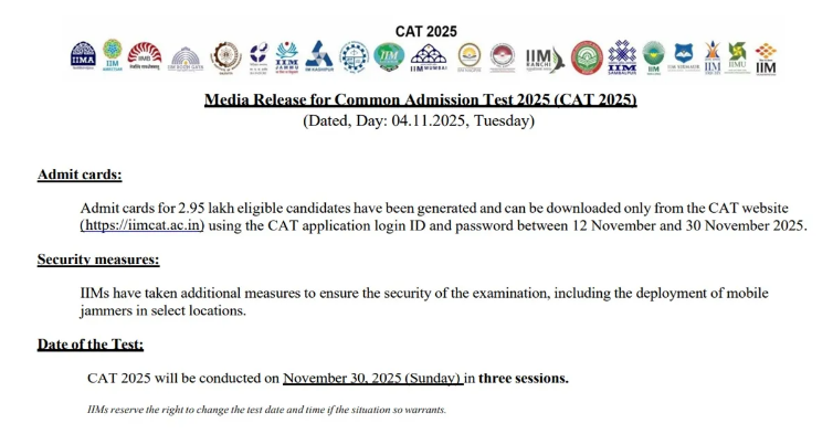 भारतीय प्रबंधन संस्थान (IIM) की ओर से कॉमन एडमिशन टेस्ट (CAT) परीक्षा में शामिल होने के लिए एडमिट कार्ड जल्द ही जारी किए जा सकते हैं। बता दें, देशभर में IIM CAT 2025 परीक्षा 30 नवंबर को आयोजित कराई जाएगी। ऐसे में आईआईएम की आधिकारिक अधिसूचना के तहत परीक्षा में शामिल होने के लिए एडमिट कार्ड 12 नवंबर को जारी कर किए जाएंगे। जो उम्मीदवार इस परीक्षा में शामिल होना चाहते हैं, वे 12 नवंबर से अपना एडमिट कार्ड डाउनलोड कर सकेंगे। एडमिट कार्ड डाउनलोड करने के लिए उम्मीदवारों को रजिस्ट्रेशन नबंर और पासवर्ड को दर्ज करना होगा।