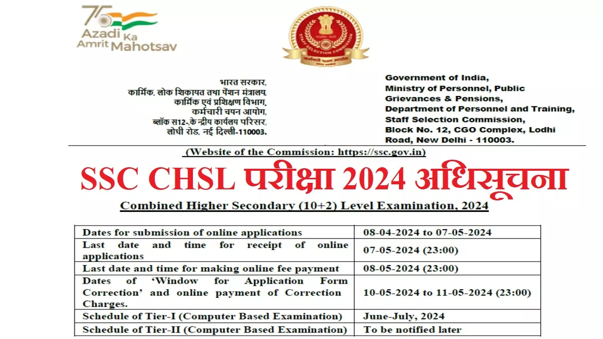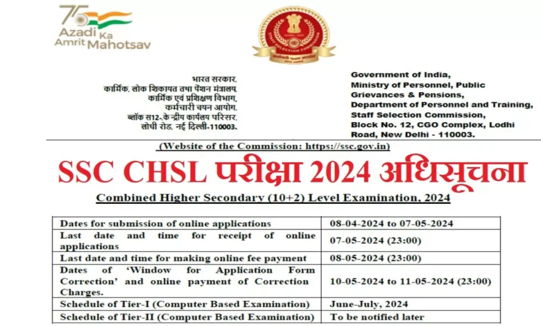 ऐसे सभी उम्मीदवारों के लिए खुशखबरी जो कि 12वीं पास सरकारी नौकरी के मौकों का तलाश कर रहे हैं। कर्मचारी चयन आयोग (SSC) ने केंद्र सरकार के मंत्रालयों, विभागों और संगठनों में 12वीं पास योग्यता वाले पदों पर भर्ती के लिए आयोजित की जाने वाली संयुक्त उच्चतर माध्यमिक (10+2) परीक्षा 2024 की अधिसूचना जारी कर दी है। आयोग द्वारा सोमवार, 8 अप्रैल को जारी अधिसूचना (SSC CHSL Exam 2024 Notification) के अनुसार इस बार परीक्षा का आयोजन 3712 पदों पर भर्ती के लिए किया जाएगा।
