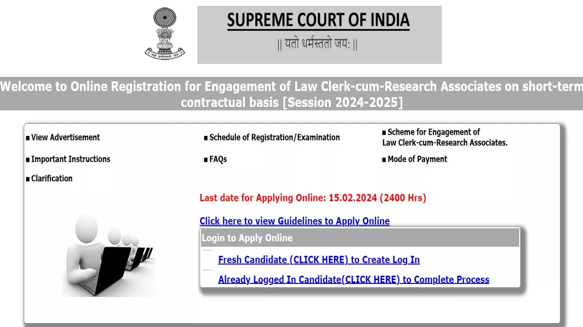सुप्रीम कोर्ट में सरकारी नौकरी पाने का सपना देख रहे उम्मीदवारों के लिए खुशखबरी है। सुप्रीम कोर्ट ऑफ इंडिया (SCI) की ओर से लॉ क्लर्क कम रिसर्च एसोसिएट के 90 रिक्त पदों को भरने के लिए भर्ती निकाली गई है। इस भर्ती के लिए आवेदन प्रक्रिया शुरू हो चुकी है जो निर्धारित अंतिम तिथि 15 फरवरी 2024 तक जारी रहेगी।