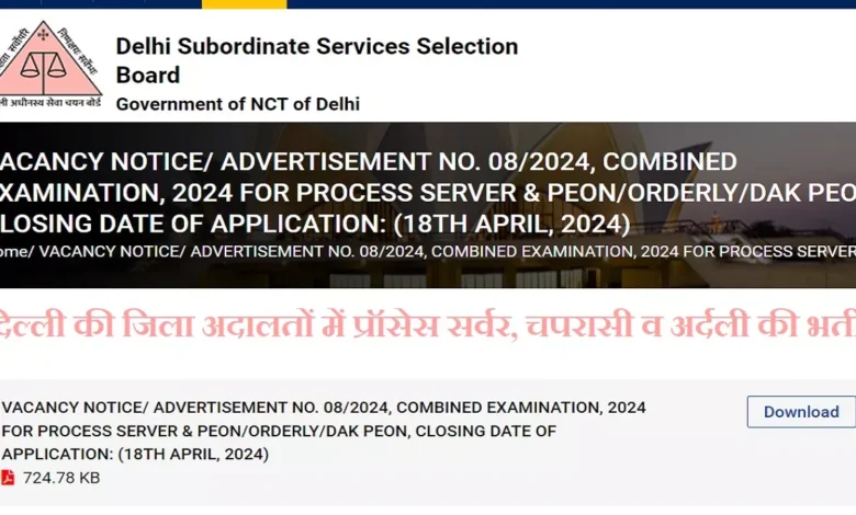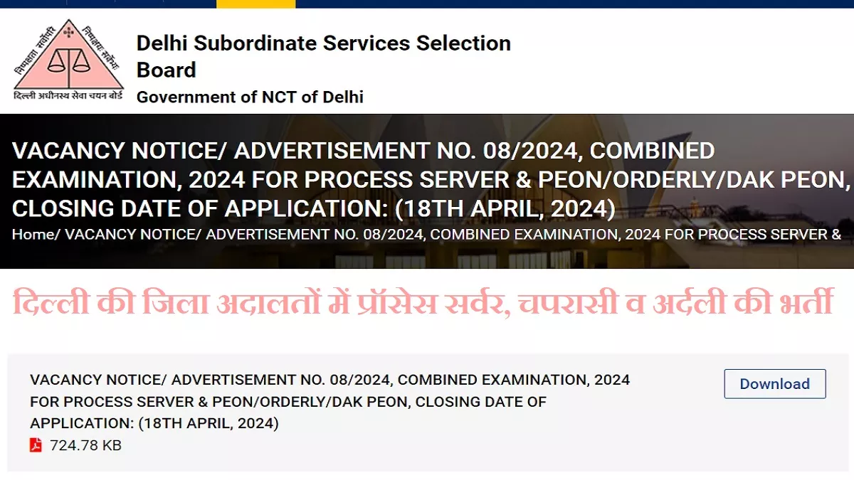 दिल्ली में सरकारी नौकरी के इच्छुक उम्मीदवारों के लिए काम की खबर। दिल्ली की जिला अदालतों और पारिवारिक न्यायालयों में विभिन्न पदों पर भर्ती के लिए अधिसूचना दिल्ली अधीनस्थ सेवा चयन आयोग (DSSSB) द्वारा जारी की गई है। बोर्ड द्वारा हाल ही में 12 मार्च को जारी विज्ञापन (सं.08/2024) के अनुसार जिला व पारिवारिक न्यायालयों में प्रॉसेस सर्वर, चपरासी / अर्दली / डाक चपरासी के कुल 102 पदों पर भर्ती (Delhi District Court Recruitment 2024) की जानी है।