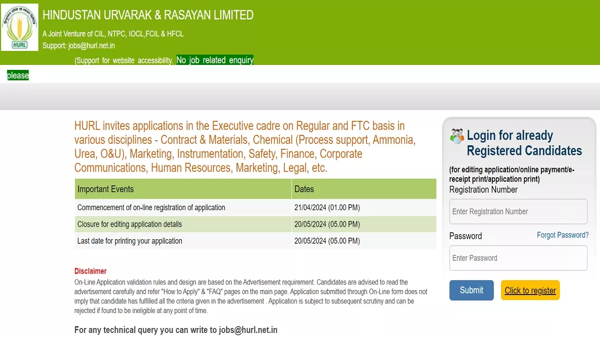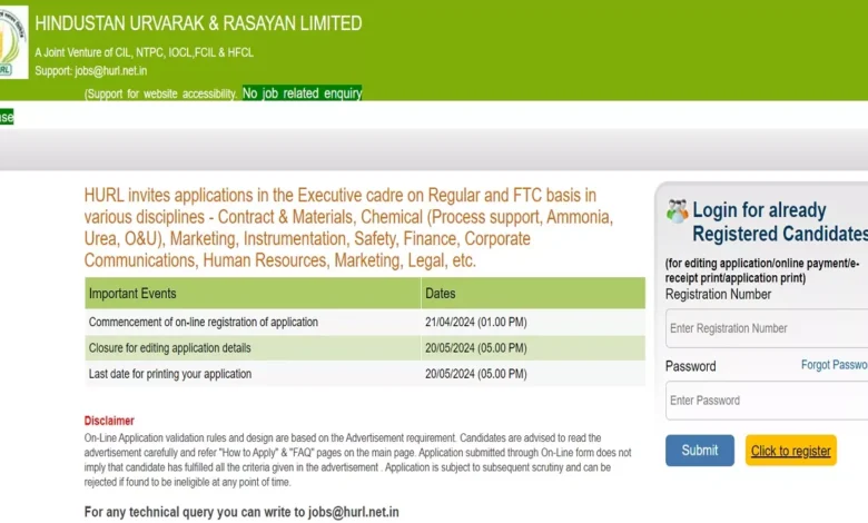 हिंदुस्तान उर्वरक एवं रसायन लिमिटेड (HURL) की ओर से मैनेजर इंजीनियर और ऑफिसर के रिक्त पदों पर भर्ती चल रही है। इस भर्ती में शामिल होने के लिए आवेदन की अंतिम तिथि आज यानी 20 मई 2024 निर्धारित है। ऐसे में जो अभ्यर्थी सरकारी नौकरी की तलाश में हैं और इस भर्ती के लिए पात्रता पूरी करते हैं वे वे बिना देरी करते हुए तुरंत ही फॉर्म भर सकते हैं।