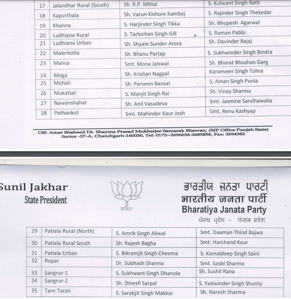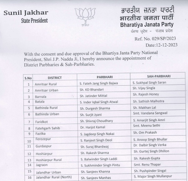पंजाब भाजपा में जिला प्रभारी व सह प्रभारियों की गई नियुक्ति