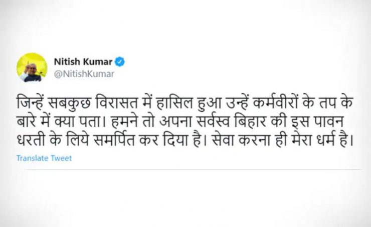 नीतीश ने एक ट्वीट कर लिखा कि जिन्हें सबकुछ विरासत में हासिल हुआ उन्हें कर्मवीरों के तप के बारे में क्या पता. हमने तो अपना सर्वस्व बिहार की इस पावन धरती के लिये समर्पित कर दिया है. सेवा करना ही मेरा धर्म है.’