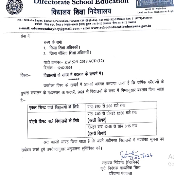 चंडीगढ़ः हरियाणा के स्कूलों की टाइमिंग में एक बार फिर से शिक्षा विभाग ने बदलाव किया है। गौरतलब है कि हरियाणा सहित उत्तर भारत में पड़ रही कड़ाके की ठंढ के कारण मौसम के अनुकूल स्कूलों के लिए समय में बदलाव किया गया था। लेकिन अब मौसम बदल रहा है। ठंढ कम हो गई है। जिसके चलते शिक्षा विभाग ने सिंगल शिफ्ट के स्कूलों को सुबह 8 बजे से दोपहर ढाई बजे तक खोलेने के आदेश जारी किया है।