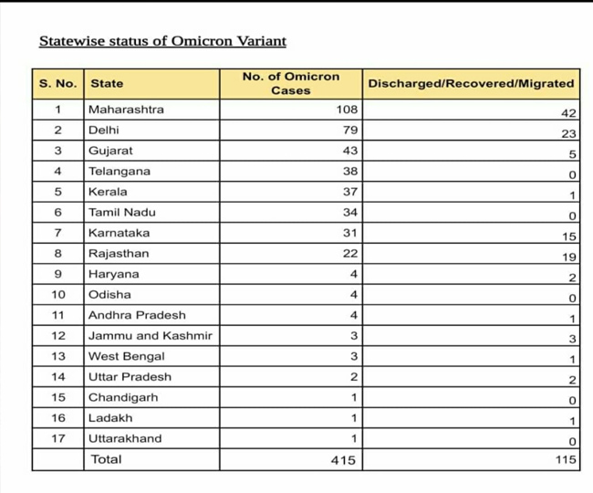 देश में तेजी से बढ़ रहे ओमिक्रोन वैरिएंट के मामले, कुल संक्रमितो की संख्‍या हुई 415….