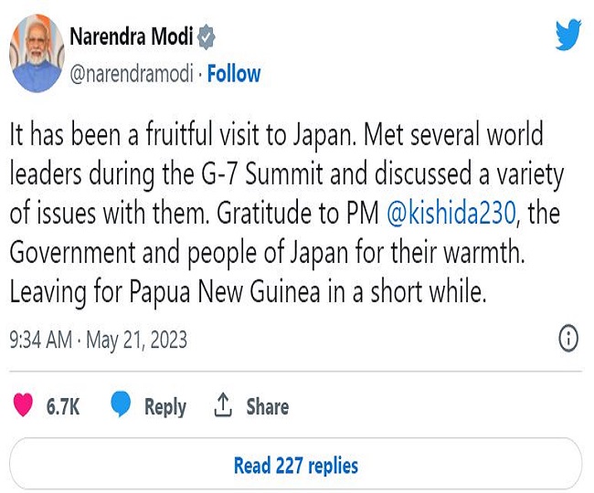 पीएम मोदी ने ट्विटर पर लिखा, ‘जापान की यात्रा सार्थक रही। G-7 समिट के दौरान दुनिया के कई नेताओं से मुलाकात की और उनके साथ कई तरह के मुद्दों पर चर्चा की. गर्मजोशी के लिए पीएम @kishida230, जापान की सरकार और जनता का आभार। थोड़ी देर में पापुआ न्यू गिनी के लिए रवाना हो रहा हूं।”