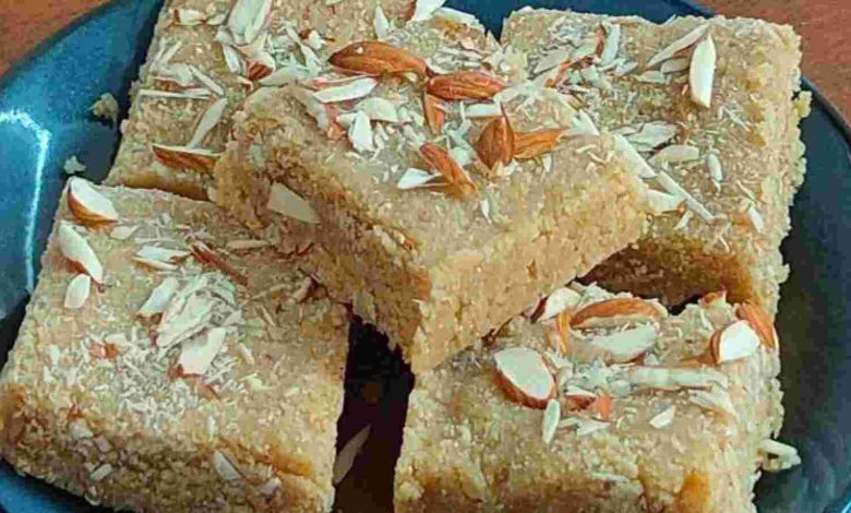 चूरमा बर्फी बनाने के लिए सबसे पहले एक कड़ाही में बेसन डालकर उसे धीमी आंच पर सेकें। ध्यान रखें कि बेसन को बहुत ज्यादा नहीं सेंकना है। इसके बाद सिके बेसन को एक बड़े बर्तन में निकाल लें और उसमें पिघला हुआ देसी घी डालकर उसका घोल तैयार कर लें। इसके बाद इस घोल को कुछ देर के लिए अलग रख दें।