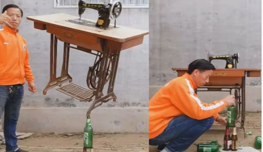 वायरल हो रहे वीडियो में आप देख सकते हैं कि एक शख्स पहले संगमरमर के पत्थर पर दो बोतलें रखता है. उसके ऊपर एक और बोतल रख देता है. इसके ऊपर वो अपने एक साथी की मदद से पूरी-पूरी सिलाई मशीन उसके टेबल समेत ही टिकाने की कोशिश करता है. एक बार तो मशीन गिर पड़ती है लेकिन अगली बार में वो बिल्कुल प्वाइंट पर टिक जाती है.