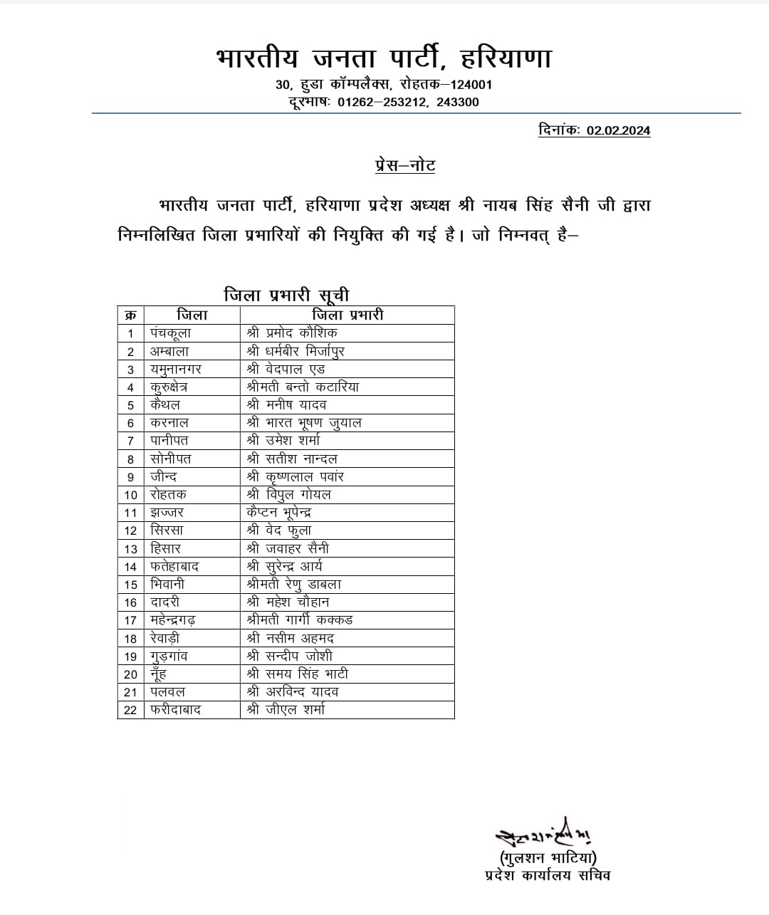 हरियाणा: भाजपा प्रदेश अध्यक्ष नायब सैनी ने की जिला प्रभारियों की नियुक्ति