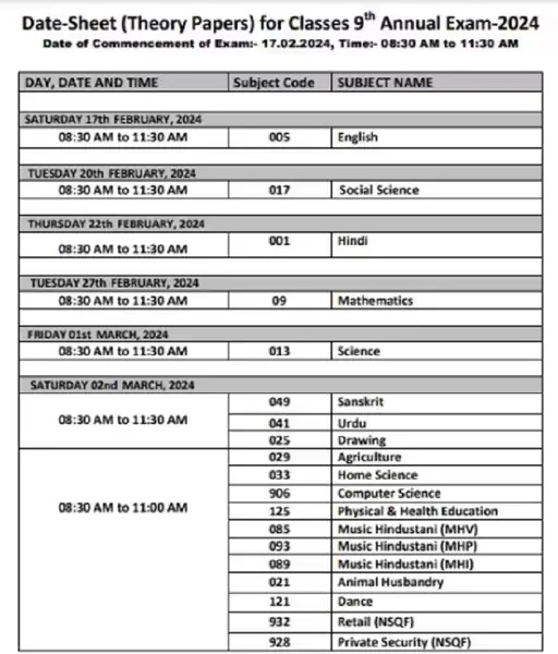 हरियाणा विद्यालय शिक्षा बोर्ड ने 9वीं और 11वीं की वार्षिक परीक्षाओं का टाइम टेबल जारी कर दिया है। जारी टाइम टेबल के अनुसार कक्षा 11वीं की परीक्षा 15 फरवरी और 9वीं कक्षा की 17 फरवरी से शुरू होगी।