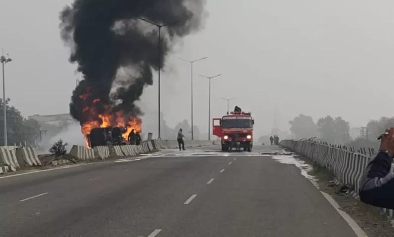 खन्ना में नेशनल हाईवे पर तेल से भरे टैंकर में लगी भीषण आग