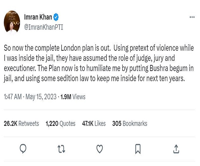 पाकिस्तान तहरीक-ए-इंसाफ प्रमुख ने सोमवार तड़के सिलसिलेवार ट्वीट में कहा, “तो अब लंदन की पूरी योजना सामने आ गई है। उन्होंने जज, ज्यूरी और जल्लाद के रूप में काम किया, जबकि मैं हिंसा के बहाने जेल में था।” ” खान ने अपने लाहौर आवास पर पीटीआई नेताओं की बैठक के बाद यह ट्वीट किया और अब बुशरा बेगम को जेल में डालकर मुझे अपमानित करने की योजना है और दस साल तक मुझे अंदर रखने के लिए कुछ देशद्रोह कानून का इस्तेमाल किया जा रहा है।