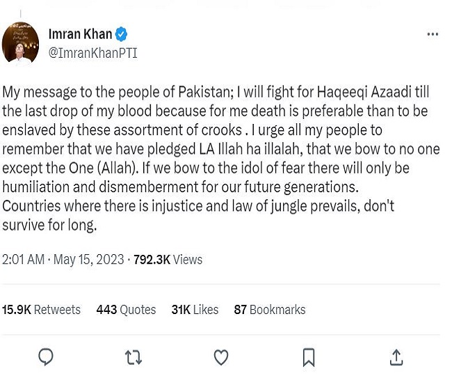 इमरान खान ने कहापाकिस्तान के लोगों के लिए मेरा संदेश है कि मैं अपने खून की आखिरी बूंद तक हकीकी आजादी के लिए लड़ूंगा। उन्होंने यह भी दावा किया कि देश की सेना ने देशद्रोह के आरोप में उन्हें अगले 10 साल तक जेल में रखने की योजना बनाई है।