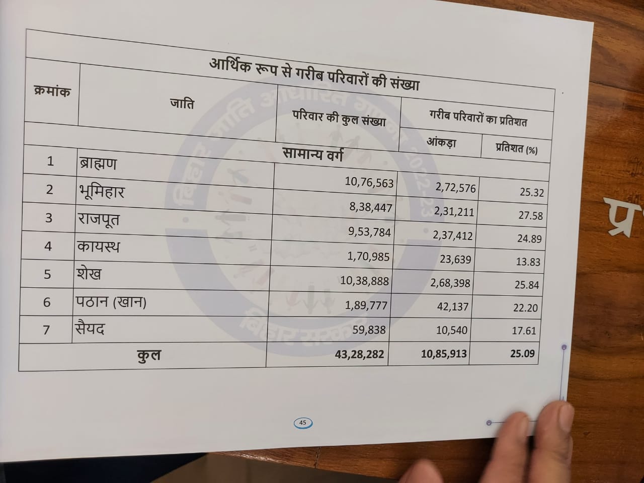 सामान्य वर्ग में कायस्थ परिवारों में आर्थिक रूप से कमजोर परिवार की आबादी 1.70 लाख बताई गई है, अर्थात कायस्थों की कुल पारिवारिक आबादी में 13.89 प्रतिशत की माली हालत ठीक नहीं। शेख परिवार की कुल आबादी करीब 11 लाख है इसमे 2.68 लाख यानी 25.84 प्रतिशत परिवार आर्थिक रूप से कमजोर बताए गए हैं।
